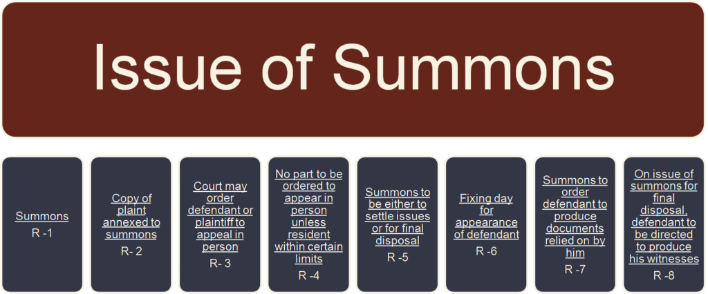 Order V Rule 5: Summons to be either to settle issues or for final disposal The summons may be issued for settlement of issues or for final disposal of the suit and the court shall at the time of issuing the summons specify for what purpose summons are being issued and it must contain a direction accordingly. The Court of Small Causes shall issue summons for final disposal only